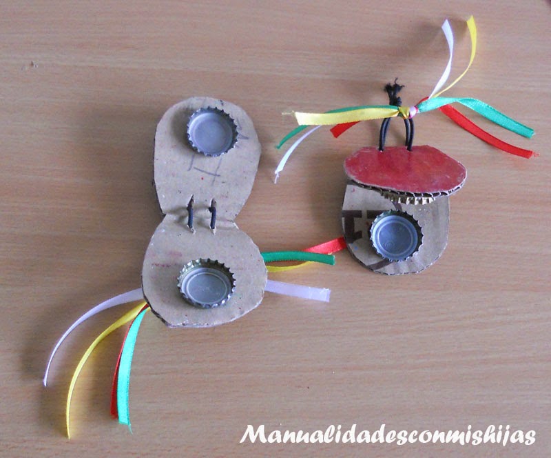 Otra versión de las castañuelas con mucho toque español, en esta ocasión con chapas. El cartón, dependiendo de la edad del niños, lo pueden recortar ellos o un adulto, ya que la fuerza que hay que hacer para recortar el cartón es considerable. Pega las chapas y decora con cintas y pintura.