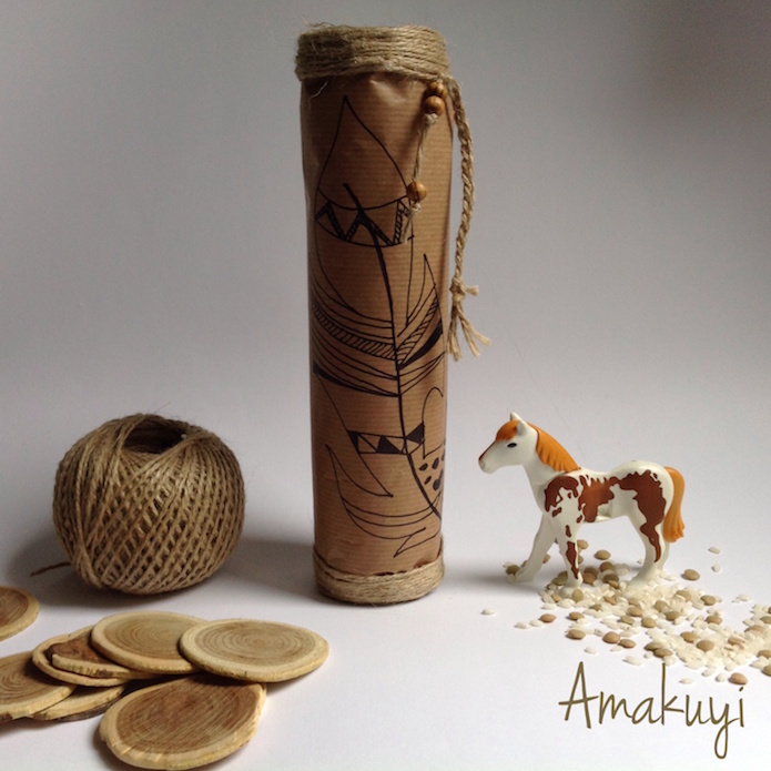Este instrumento musical me gusta mucho, incluso tenemos uno hecho solo falta decorarlo y Amakuyi me ha dado la genial idea de acolcharlo para cubrir los palitos, que justo ahí es donde me había quedado. Este instrumento es de origen indigena y sirve para imitar al sonido de la lluvia.