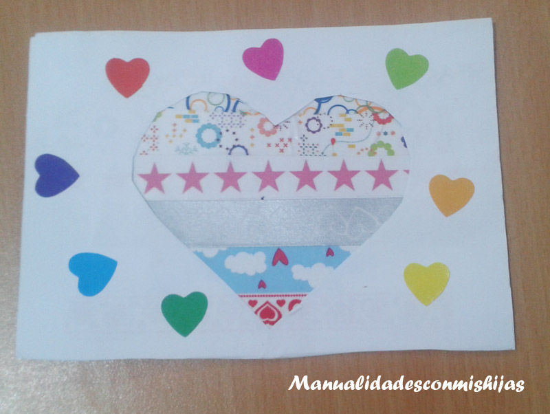 Seguro que a tu peque le gustan las pegatinas, si es así le encantará hacer esta tarjeta. El material principal es el washi tape, y lo mejor es que pueden hacer las combinaciones tan coloridas y variadas como gusten. Es una idea que nos comparte Manualidades con Mis Hijas.