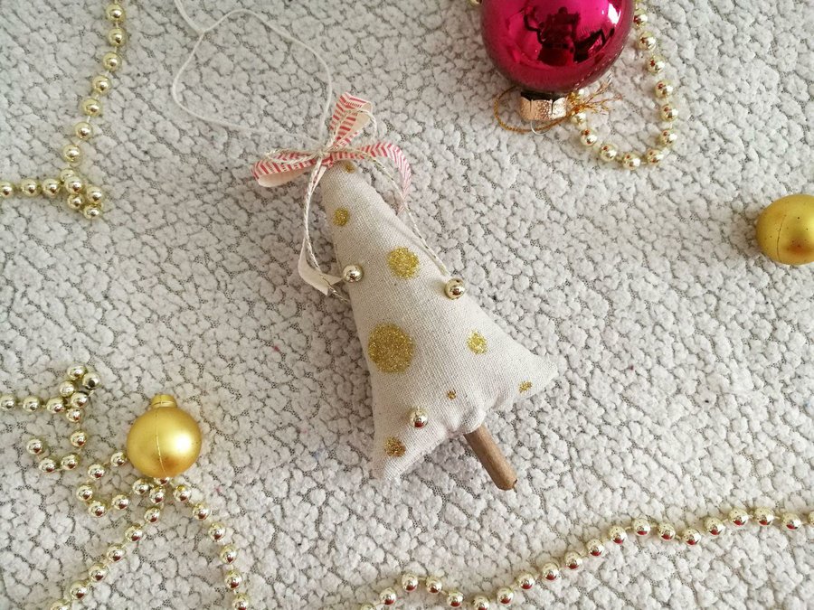 Adornos Nº8: Silicón, Hilo y aguja, Tela de lino, Rama seca, Cinta, Hilo de Bordar, Bolitas doradas, Pegamento de purpurina