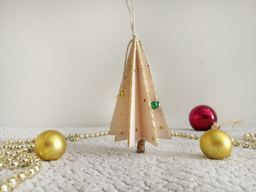 Adorno Nº1: Silicón, Madera balsa, Pegamento de purpurina, Cordón decorativo, Mini Cascabeles, Ramita seca