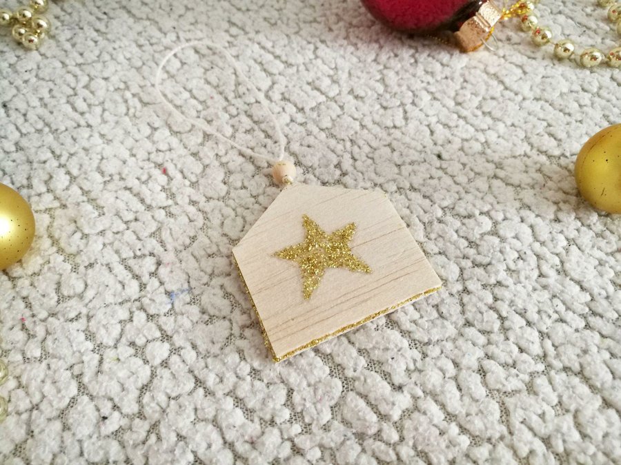 Adorno Nº3: Silicón, Madera Balsa, Pegamento de Purpurina, Hilo de bordar, Bolita de madera