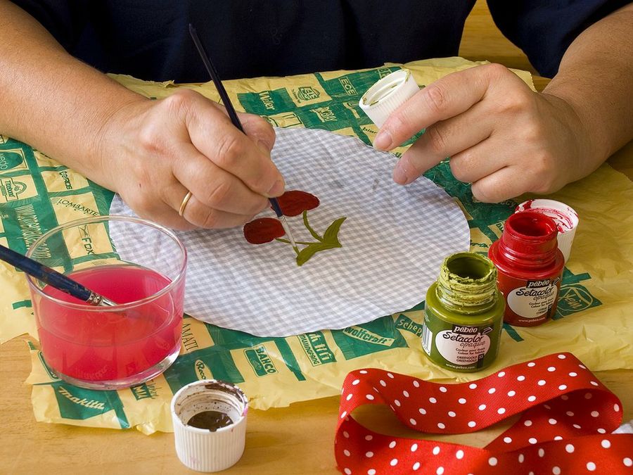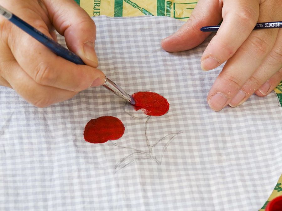 Trazamos a lápiz el dibujo de las cerezas, un motivo sencillo y muy alegre, y comenzamos a rellenar con los pigmentos especiales. Tendremos cuidado en los bordes, dado que la pintura puede rebasarlos por absorción de los hilos.
