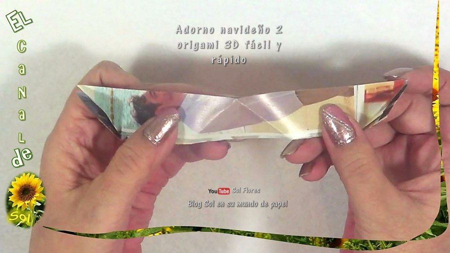 Cortamos tiras de 17 cm. de largo por 2.5 cm. de ancho, empalmamos dos, doblamos uno de los extremos para formar un triángulo y en el otro extremo igual, doblamos y marcamos la mitad, tomando en cuenta esta marca doblamos los extremos al centro y del otro lado igual,