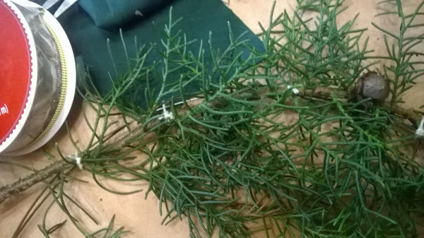 Primero hay que hacer un círculo con el alambre y enroscar sus extremos con una pinza. Luego se van colocando las ramas y atando con el hilo al alambre. Una vez realizado esto se coloca un retazo de tela verde (5cm de ancho y el largo que se necesite) que atraviese el diámetro del círculo. La cinta navideña se ubica alrededor de la ramas.