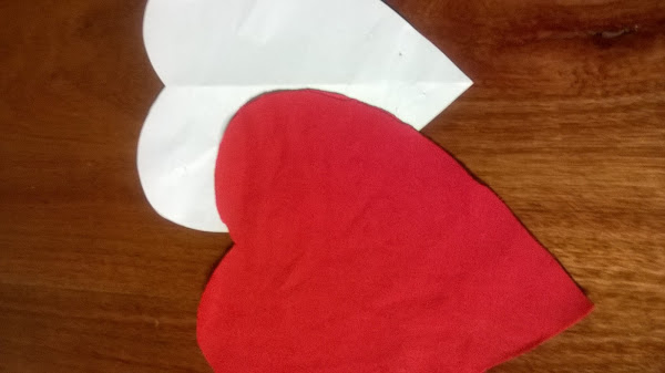 Para hacer el corazón, se dobla a la mitad el papel y se dibuja la mitad del mismo, se recorta y obtendremos el corazón, el cual colocaremos con alfileres sobre la tela roja para luego cortar. Una vez que tenemos ambas caras del corazón, cosemos ( yo lo hice a mano, pero pueden usar máquina), rellenamos con guata y terminamos la costura.