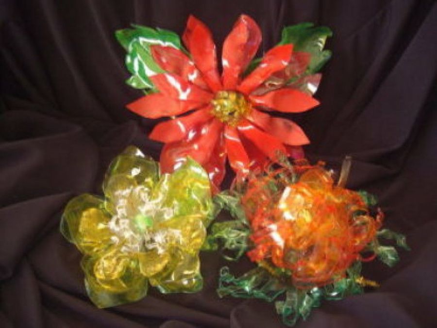 Con estos dos materiales son infinitas las manualidades que se pueden hacer. La usuaria millivilcon hizo unas fantásticas flores con trozos de botellas de gaseosas. Únicamente necesitó las botellas, acrílicos y una vela para moldear el plástico.