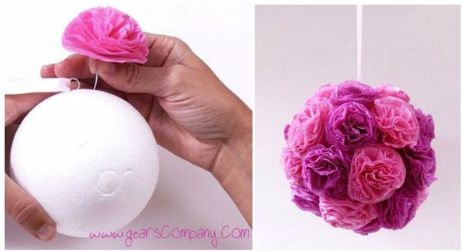 3.- Usa una bola de poliespan o telgopor, y mete las flores que acabas de hacer, así tendrás un lindo adorno para tu fiesta, mete una argollita dentro de la bola para poder colgar tu adorno con un listón.