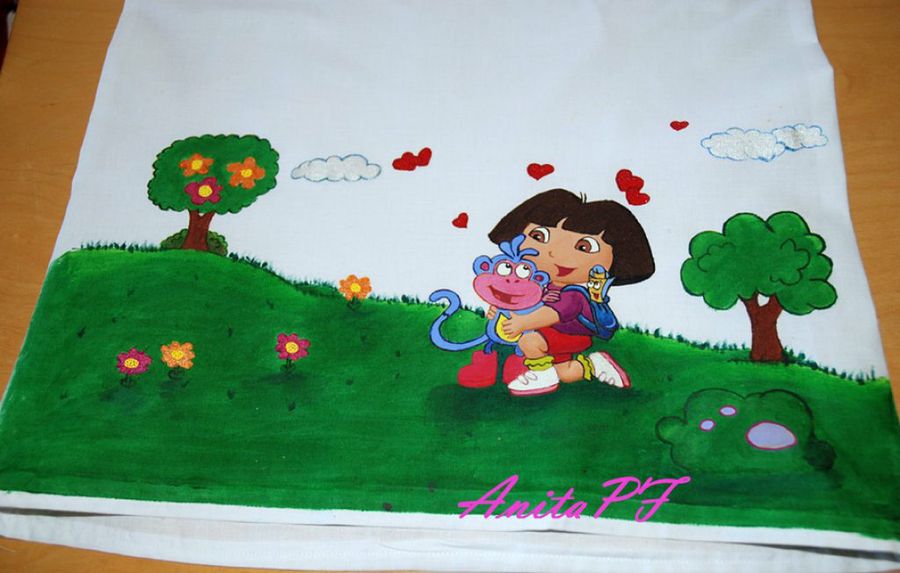 Y finalmente, aquí tenemos a Dora la exploradora con su amigo el monito, personajes que hacen las delicias de las más pequeñas. Por ese motivo, AnitaPF los escogió para decorar el vestido de su princesita.