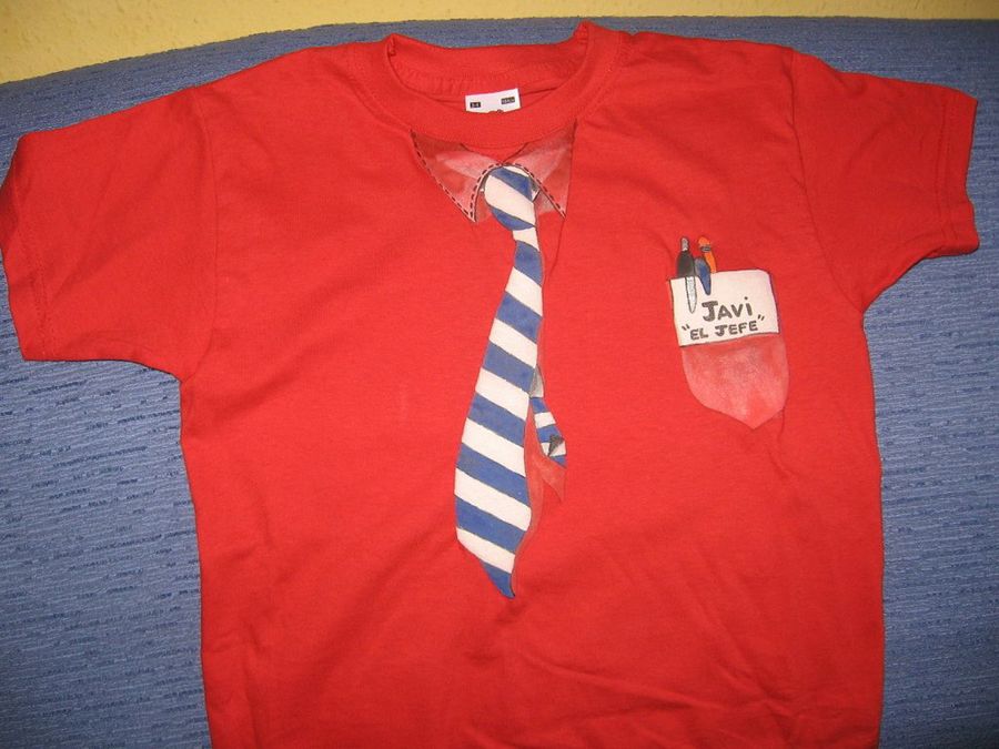 Virgitenerife se pirra por hacer camisas para su sobrinillo Javier, de 5 años. Y con buen humor, la artista nos explica este diseño, que irradia todo el empaque adecuado para un pequeño gran ejecutivo: ¿¡Como la cosa está muy mala lo hemos puesto a trabajar! Pero claro, tal y como es el niño... ¡ha cogido el mejor cargo de la empresa!¿