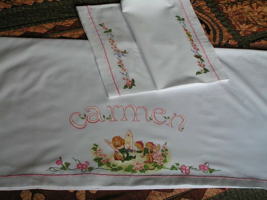 Tela-pinto ha hecho estas sábanas para un bebé. Observemos los maravillosos degradados, típicos de la gran artista. Dado que no suelen venderse sábanas lisas, nuestra forera adquiere la tela y las cose ella misma.