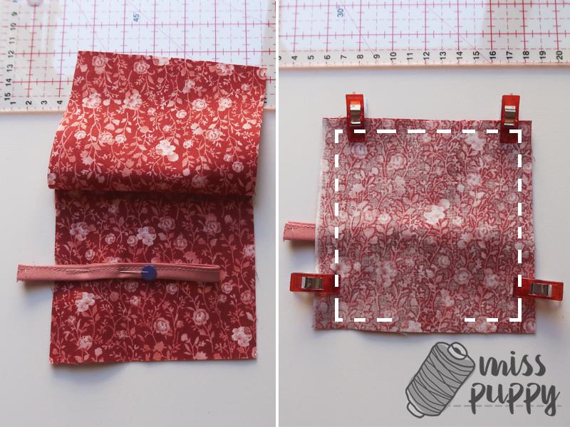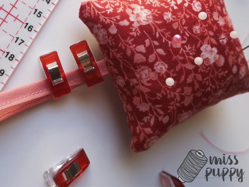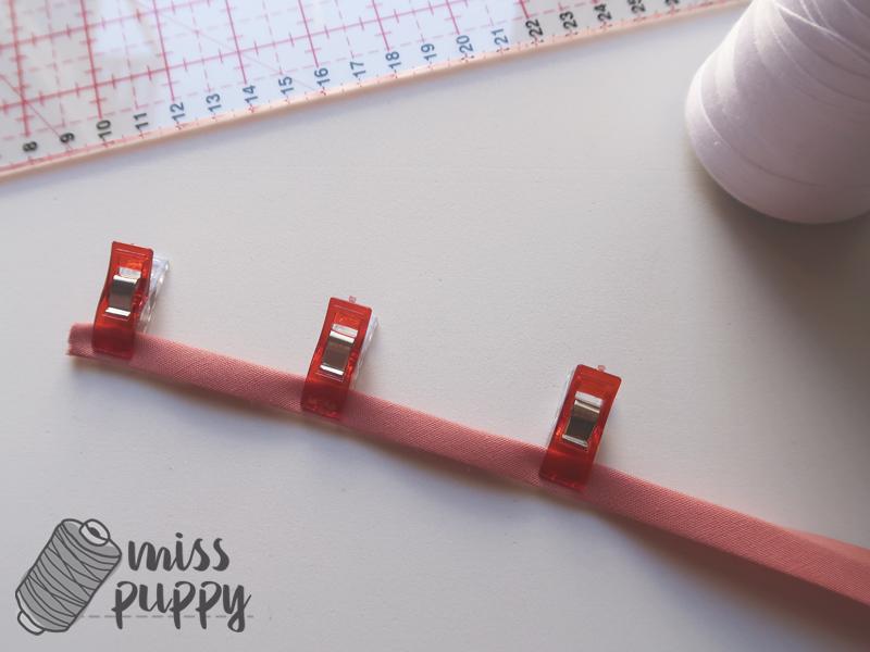 El biés lo vas a utilizar para hacer una especie de agarre, donde podrás poner tus clips o pinzas que tanto están de moda y tan útiles son. ¡Yo estoy super in love con los míos! Así tendrás en el mismo alfiletero todo lo que necesitarás en tus labores. Para hacerlo, dobla el biés por la mitad, a lo largo, y haz un pespunte a unos 2 mm del borde. Para que no se te mueva, puedes plancharlo, hilvanarlo o fijarlo con clips/alfileres.