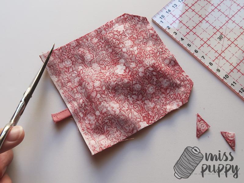 Es hora de cortar las esquinas y el sobrante del biés, así el acabado en ellas será mucho mejor al no tener tela de más. Dale la vuelta a la labor con cuidado, sacando bien las esquinas y plánchalo si es necesario.