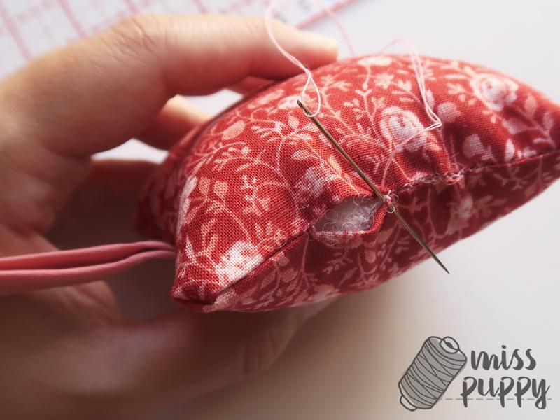 Ahora, con relleno de cojín (yo utilizo el de fibra hueca de poliéster) ve almohadillando el alfiletero hasta que esté muy bien lleno. Esto es importante, no escatimes en el relleno. Si no tiene suficiente, la punta de los alfileres puede salir por el lado contrario y pincharte. Así que asegúrate de meter todo lo que quepa hasta que esté bien prieto.