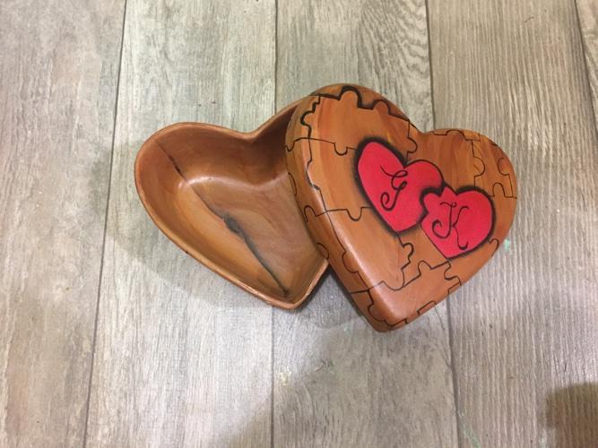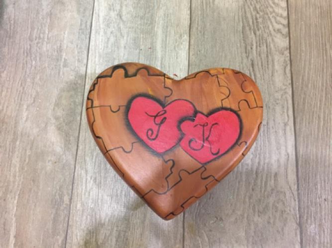 Para hacer el decorado te aconsejo que de un post it hagas un corazón para que los calques en medio del alhajero. después con otro post it guíate para ir formando las fichas de rompecabezas el post it te va a ayudar a que las líneas te salgan mas derechas y tu trabajo se vea mejor. Una vez que termines de bosquejar ahora pinta de color rojo los corazones y con el linar delinea de negro todas las piezas del rompecabezas que dibujaste anteriormente. No olvides hacer el rompecabezas en la base del alhajero.Una vez que termines de delinear borra con goma cualquier linea de lápiz que te haya quedado. Yo personalice los corazones poniéndole dos iniciales, aunque así solos también se ven bien!! Una vez terminado esto sella tus piezas con laca brillante y YA ESTÁ OTRO PORYECTO TERMINADO