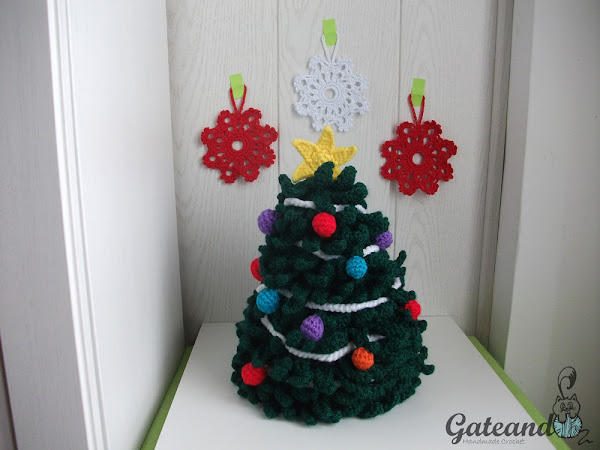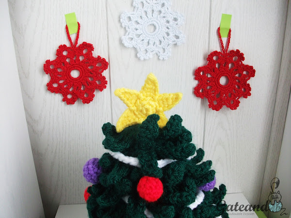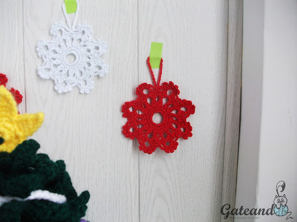 En el siguiente post, que escribiré dentro de poco, colgaré varios patrones para tejer diferentes copos de nieve como, por ejemplo, los que se ven en el fondo de la foto, para los que tengáis un árbol de navidad más grande.☺
