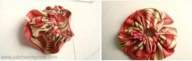 5.-Al terminar de hilvanar, jala el hilo y frunce lo cosido dirigiendolo hacia el centro, con los dedos acomoda el yoyo, para que te quede bonita y redondita.