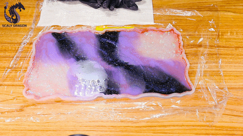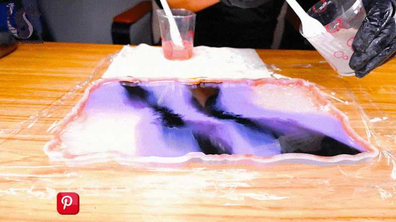 El segundo tono de resina será el morado y lo verteremos tratando de formar una líneas gruesas de forma diagonal, luego en centro del morado verteremos la resina en color negro.