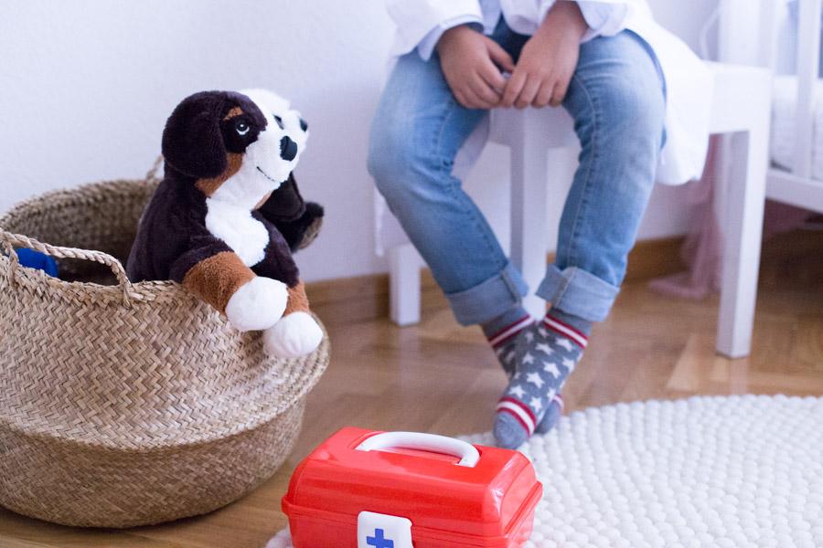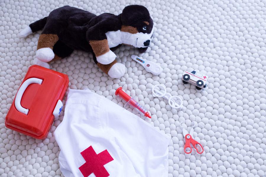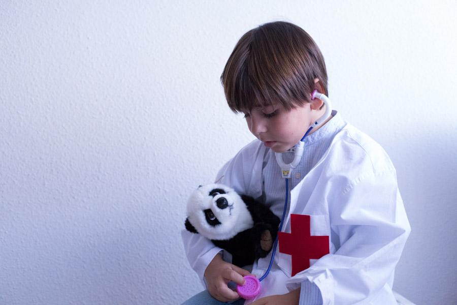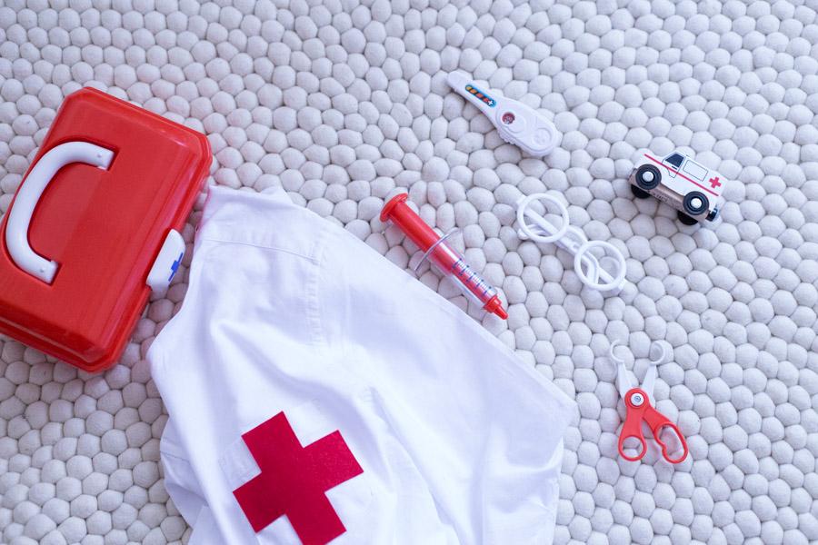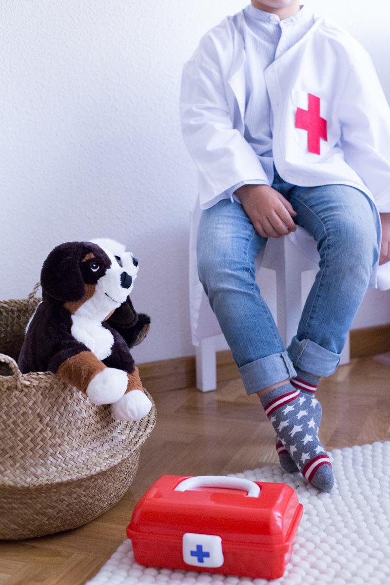 Con el fieltro rojo hice una cruz, y la cosí en el bolsillo. Y con poco tiempo ya tenemos una bata de médico para que los niños se disfracen y jugar en casa al socorrido juego de los médicos.