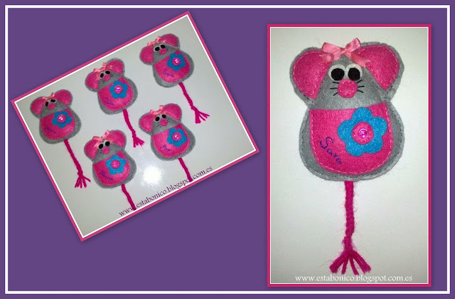 Estos son unos broches de ratonas, hechas en fieltro cada una, con su nombre personalizado...