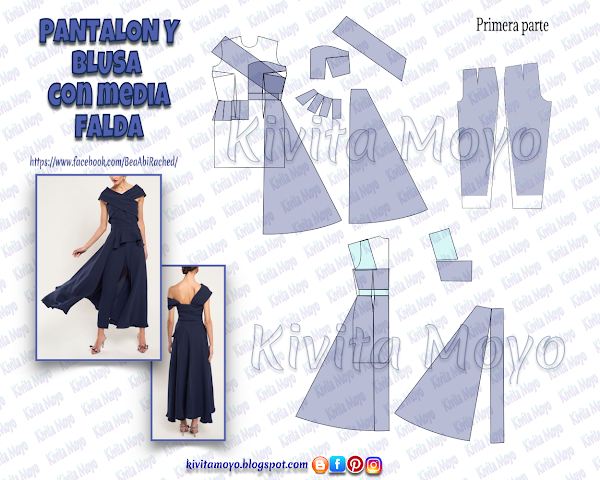 Este modelo es compuesto y ocupa el patron basico de vestido y pantalon a medida. Por un lado sera un pantalon, y por el otro una blusa con bandas cruzadas por el frente que harían el efecto de tirantes, con un cierre lateral, una sobre falda larga evase con un mini peplum frontal, acoplados a una pretina que ajusta desde el lateral.Esta diseñado para telas de punto o tejidos flexibles.Primerame ...