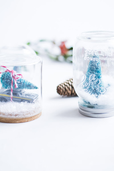 Materiales: Nieve artificial, tijeras, cinta de doble cara, cuerda roja, botes de cristal, árboles pequeños y coche en miniatura.