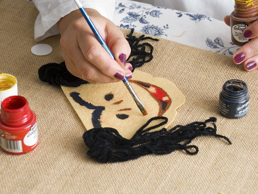 Abordamos una de las tareas decisivas: pintar las facciones. Lo haremos con un producto especial para telas, utilizando pinceles de tamaño apropiado.