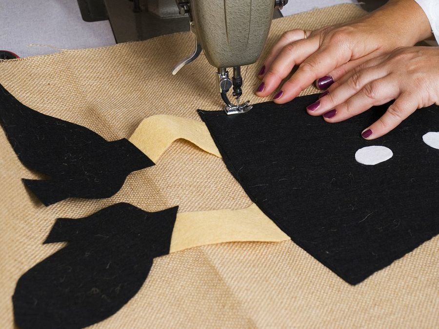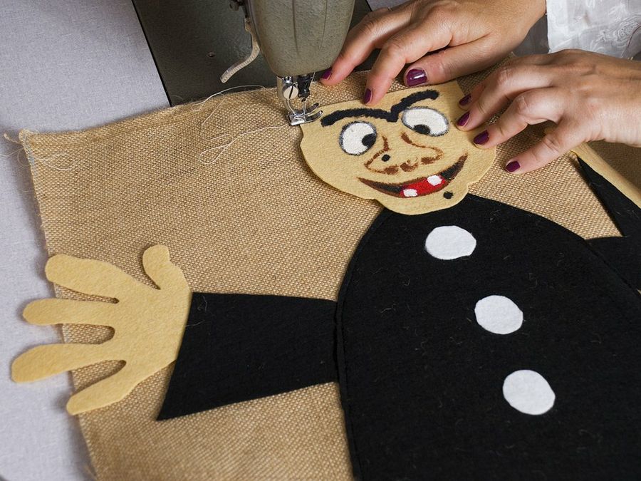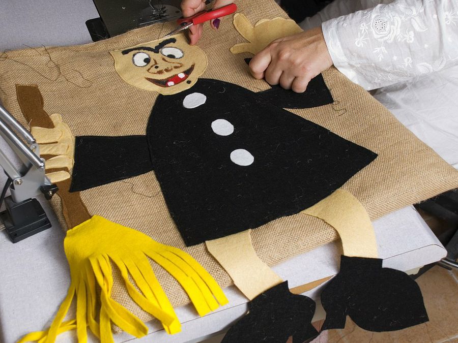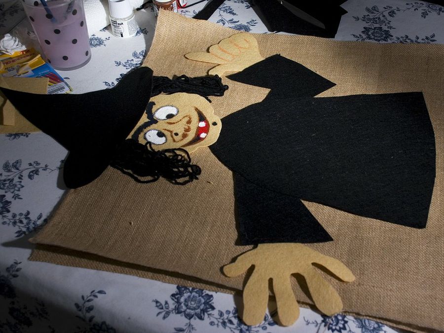 Cosemos la cabeza, que está casi en el borde para que sobresalga todo el gorro. La bruja vigila atentamente que la escoba quede bien asegurada.