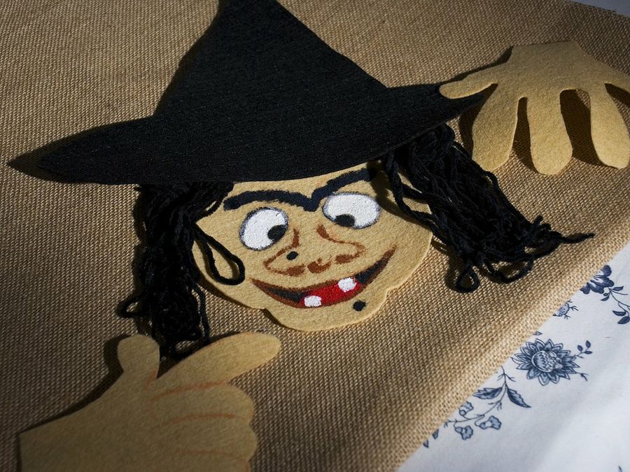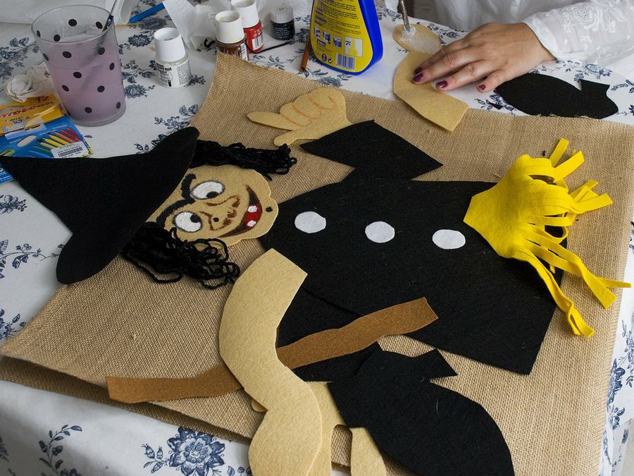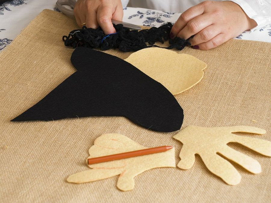El fieltro se corta fácilmente, y en un momento tenemos las manos de la bruja y su emblemático gorro puntiagudo. Haremos el pelo con lana de color negro.