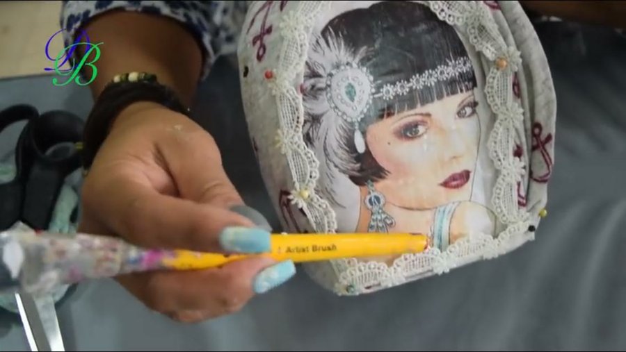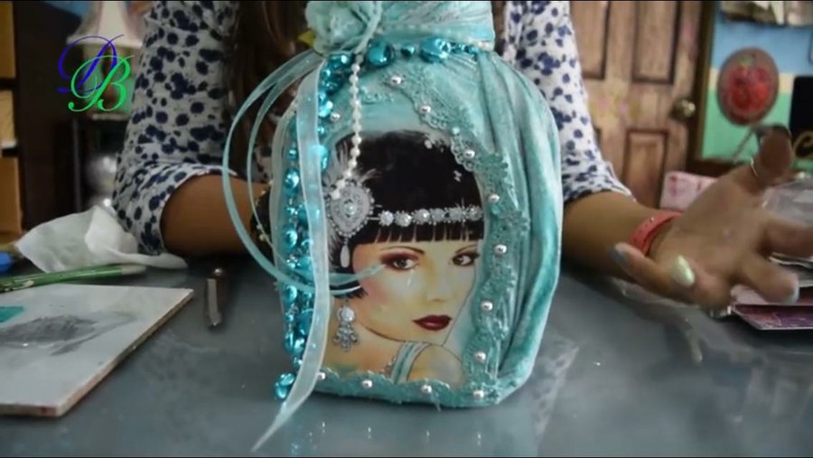 cuando nuestra botella esta completamente seca, empezaremos a pintar, según los colores de nuestra lamina o cromo, ademas lo adornaremos con encaje, abalorios.