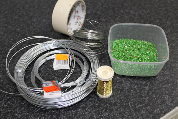 Está hecha con alambre de cobre esmaltado de 2 mm de grosor, alambre recubierto de nylon negro de 0,2 mm, una bola de vidrio negra y una arandela (de las de ferretería de toda la vida) esmaltada en azul con laca de uñas.