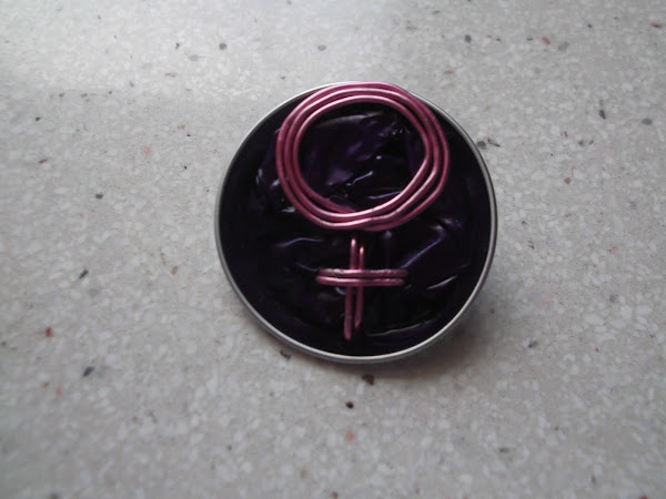 3 EUROS FEMINISTACON PURPURINACARETOCALAVERASMARIGORRINGOLA BALDOSA DE BILBAOALFILER EN COLOR CALDERA CON PIEZA DE CRISTAL VERDEBLANCO CON FLOR LILA Y PURPURINA DE COLORES