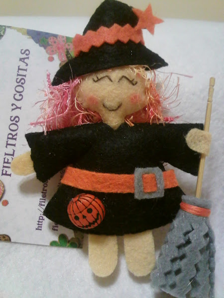 Esta bruja de fieltro tan cuqui ya esta lista para el "Truco o Trato deHalloween "seguro que consigue un montón de caramelillos...