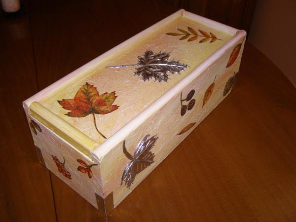 En este caso la caja estaba muy deteriorada y después de quitarle todos los herrajes tuve que encolarla bien y sujetar los laterales con puntas ocultas. La madera no era bonita y además me apetecía pintarla en color crema muy claro, para hacer el decoupage con el papel elegido. Una vez toda pintada la patiné en color marrón más intensamente por los bordes y las aristas.