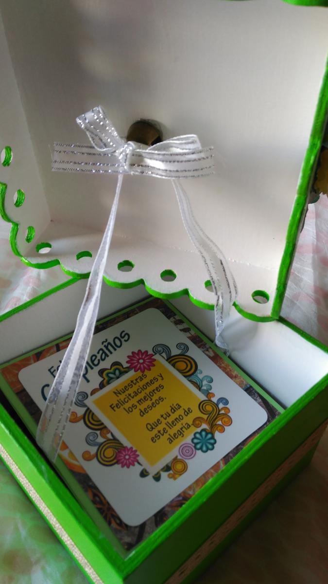 Bueno os explico; se trata de una cajita de madera a la que después de lijar le di un par de manos de pintura acrílica la pajarita en color verde manzana. Por dentro va pintada en blanco también acrílico.