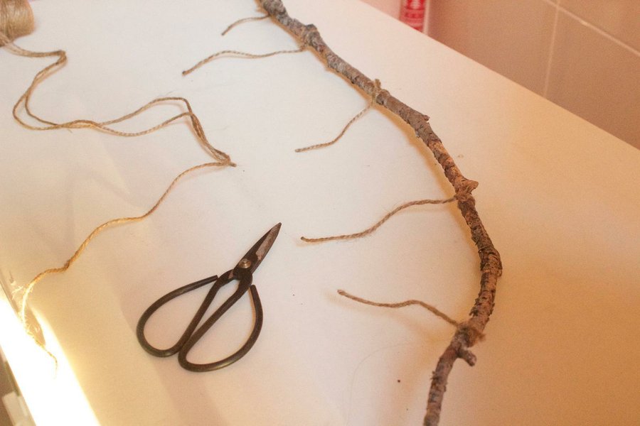 Cortamos la cuerda rústica de diferentes tamaños y la atamos a las ramas dejando espacios para que luego nos quepan las bolsitas kraft. Yo puse 8 cuerdecitas por rama ya que utilicé 3 ramas en total.