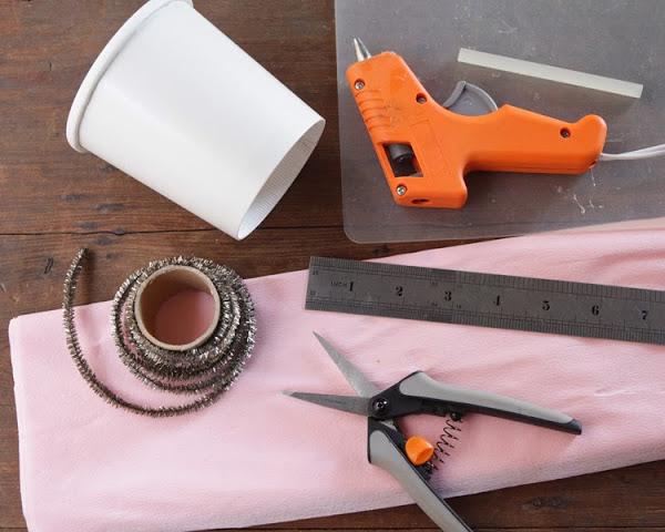 Empezamos a decorar el recipiente, usaremos la cinta o guirnalda que elegimos, pasando por el agujero de la asa.