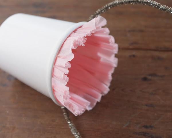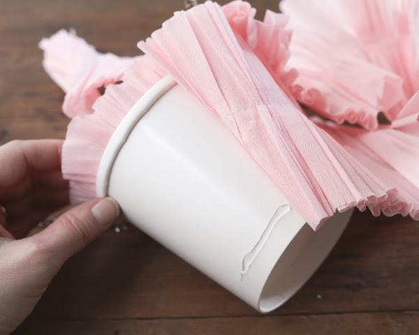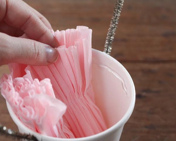 Luego, por la parte interior del balde, pegamos algunas de las tiras de papel fruncidas