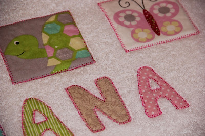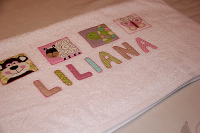 Una de las cosas que hice fue una toalla con su nombre, a la que también apliqué varios dibujos de la tela que utilicé como tela principal.