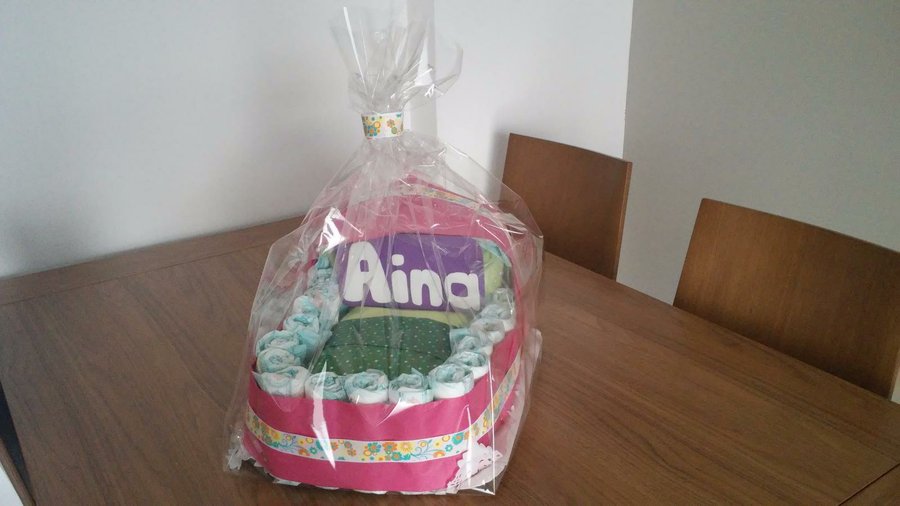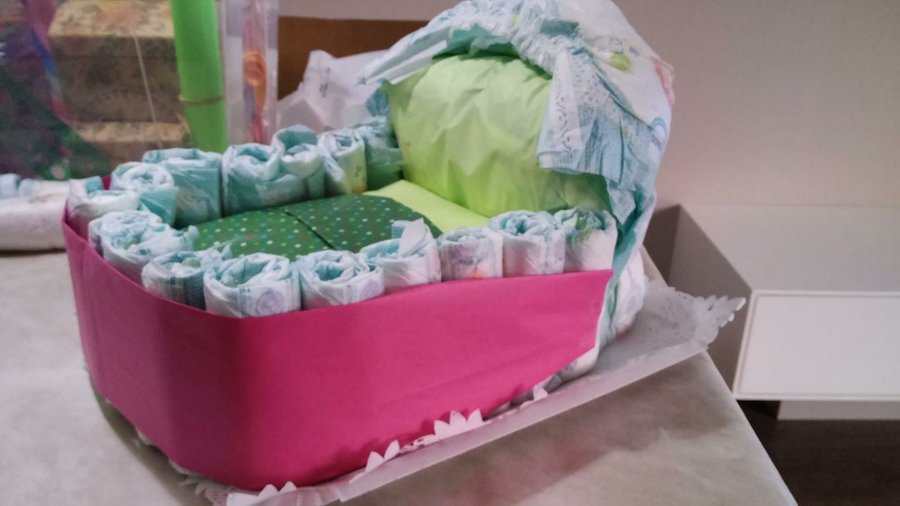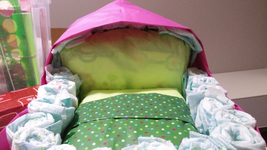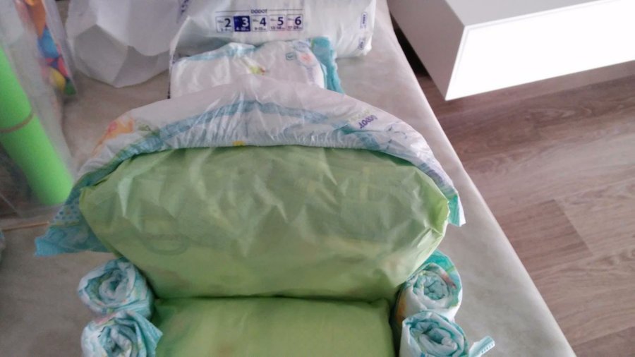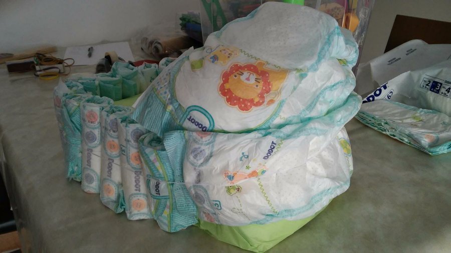 5- Enrollamos unos 16 pañales con la ayuda de las gomitas blancas pequeñas. Y los colocamos alrededor de la base que acabamos de hacer. Sujetamos los pañales con la cinta elástica.