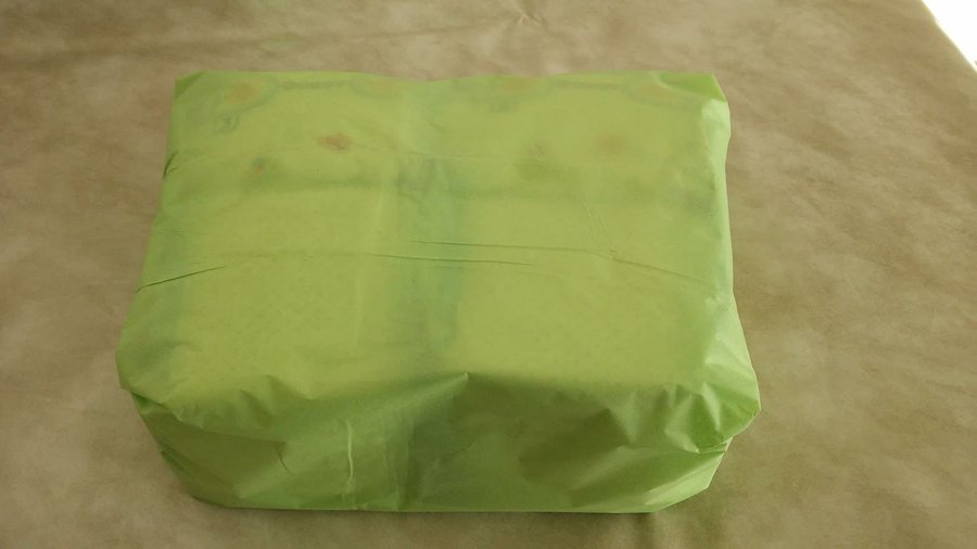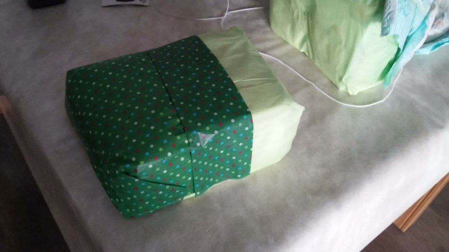 4- Cogemos uno de los paquetes y lo forramos con el trozo de papel de seda estampado, a modo de hacer una sabanita.