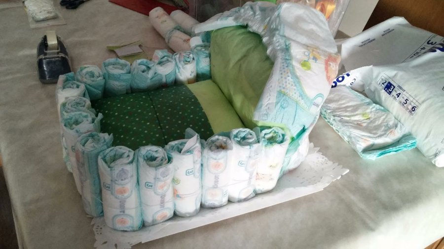 1- Hacemos la base del capazo uniendo dos paquetes de 10 pañales con una goma de pollo.