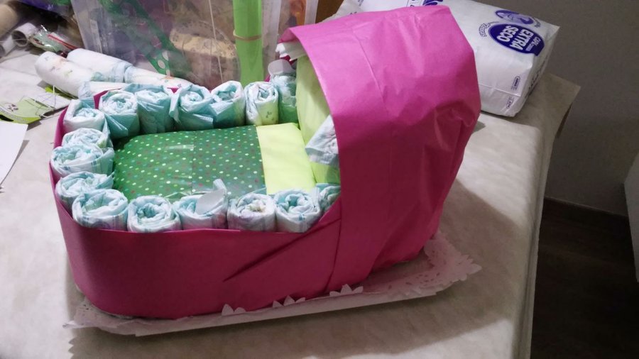 6- Forramos la parte frontal del capazo con 3 pañales abiertos.