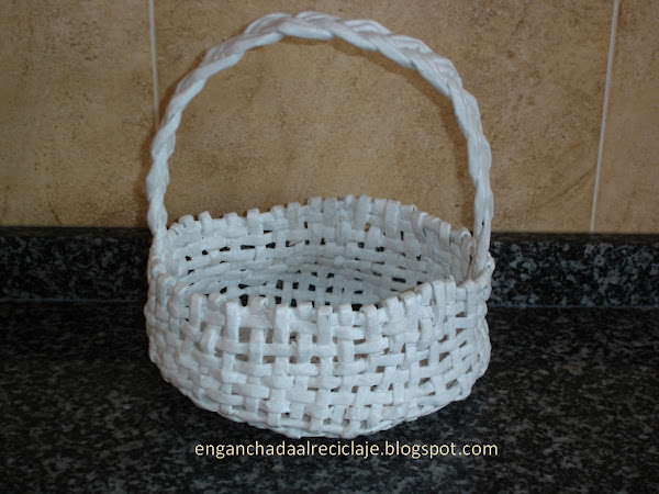 Esta cesta está hecha con periódicos y cartones.Para empezar hice un montón de rollitos de periódico, utilizando solo la parte de arriba y de abajo de las hojas para que quedaran blancos y sin letras.Corte dos cartones en forma ovalada y pegué entre ellos los extremos de los rollitos.Empecé a entrelazarlos, pasando cada uno por encima del anterior, hasta alcanzar la altura deseada.En la parte infe ...