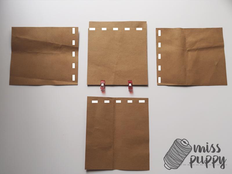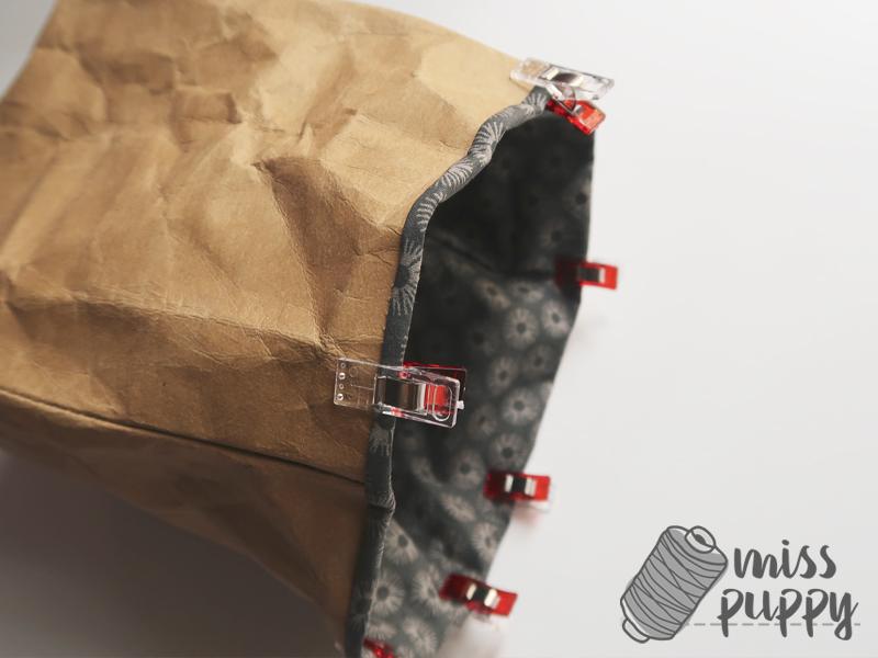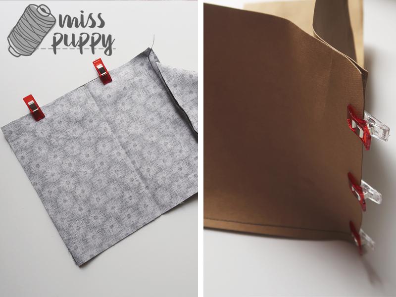 Ahora, coserás los laterales entre si. Enfrenta cada derecho de la tela con el derecho del rectángulo que tiene al lado, fíjalo con alfileres y cose en línea recta a medio centímetro del borde. Haz lo mismo con el kraftex, ¡pero recuerda que es mejor que uses clips para el!