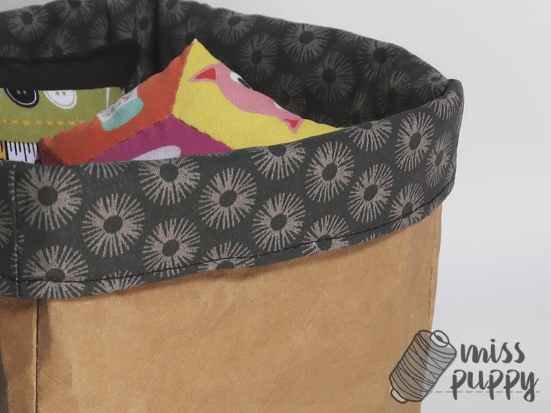 Por último, y esto es opcional, puedes volver un poco la parte superior de la cesta para que se vea esa tela tan bonita que has elegido. O incluso darle la vuelta completa para que el kraftex quede en el interior. Esto va a gustos.