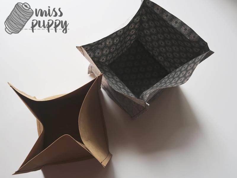 Ahora, introduce este cubo de kraftex (que está del derecho) dentro del cubo de tela (que seguirás teniendo del revés). Haz que coincidan bien las costuras de las esquinas, o te quedará torcido, y no quieres eso.