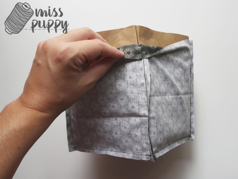 Mete la tela del forro en el interior del cubo de kraftex, asentando bien la base y colocando cada esquina en su lugar.