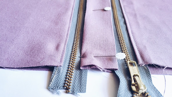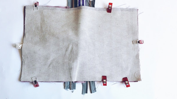 Primero coserás las dos cremalleras creando unos bolsillos. Coloca la telas exterior con el frente hacia arriba, la cremallera con el frente hacia abajo y la tela interior con el frente hacia abajo formando un "sándwich".
