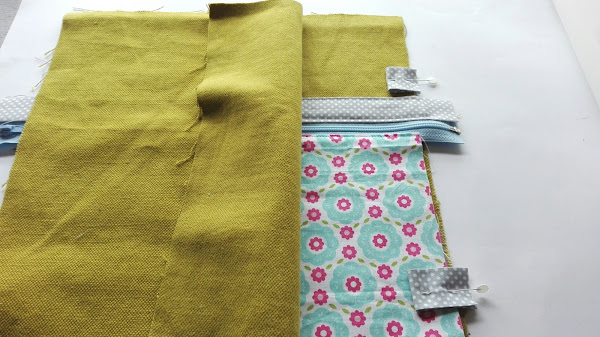 - Coloca la tela exterior de 35x32 con la cara buena hacia arriba y sobre ella coloca el bolsillo que cosiste anteriormente alineándolo en el margen inferior. Pasa un pespunte por la parte superior de la cremallera para unirla a la tela exterior.